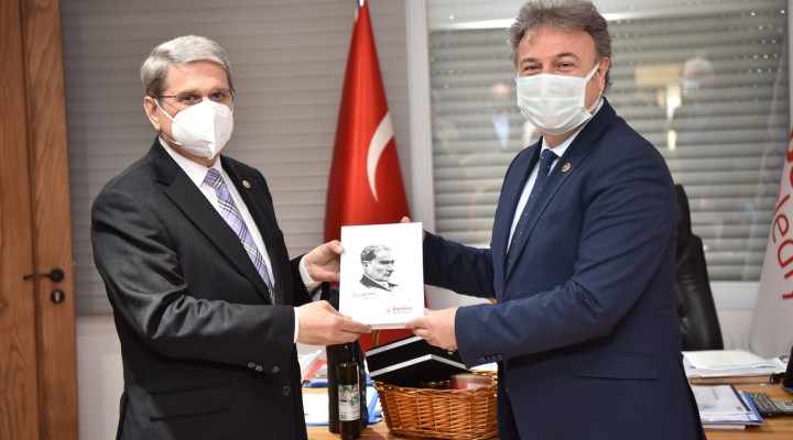 Başkan İduğ, içinde Bornovam markalı bamya, zeytin yağı, pekmez gibi yerel ürünlerin olduğu sepetlerden Çıray'a hediye etti.