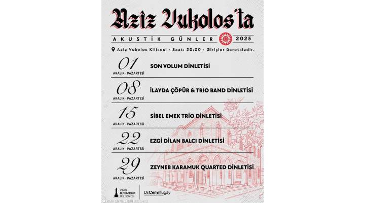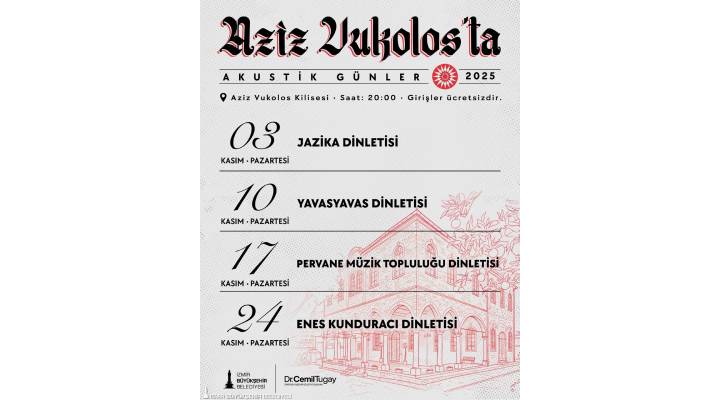 İzmir Büyükşehir Belediyesi Kültür, Sanat ve Sosyal İşler Dairesi Başkanlığı tarafından, kent kültürüne katkı sağlamak ve müzikal çeşitliliği desteklemek amacıyla “Aziz Vukolos’ta Akustik Günler” konser etkinliği düzenlenecek. Etkinlik programında, farklı müzik türlerini bir araya getiren zengin bir repertuvar yer alıyor. Müzik etkinlikleriyle hem yerel hem de evrensel müzik türlerinin bir arada sunulması, kentin kültürel çeşitliliğinin vurgulanması ve sanatseverlerin farklı müzik tarzlarını deneyimleyebilmesi amaçlanıyor.