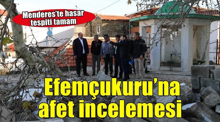 Menderes Belediye Başkanı İlkay Çiçek, yakın zamanda gerçekleşen afetten etkilenen Efemçukuru Mahallesi’ne ziyarette bulundu. Başkan Çiçek, Mahalle Muhtarı Mustafa Özdemir ile görüşerek alınan hasarla ilgili bilgi aldı. Birim müdürlerini de yanına alarak incelemeler yapan Çiçek, minaresi yıkılan ve büyük hasar gören cami ve cami yerleşkesinde tespitler yaparak gerekli talimatları verdi. Görüşmelerin bir an önce yapılıp izinlerin alınacağını ve izin verilmesi halinde çalışmaların bir an önce başlatılacağını belirtti.Biz kocaman bir aileyiz