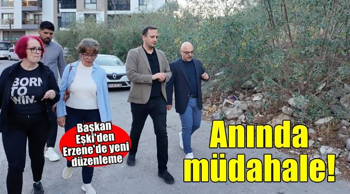Bornovalıların kentsel dönüşüm sırasında apartmanlar arasında yeşil alan olarak ayrılan yere moloz konmasından şikayet etmesi üzerine, Başkan Eşki hemen 2 sokağa giderek durumu yerinde inceledi. Bornova Belediyesi Fen İşleri Müdürlüğü ekipleri birkaç saat içinde alana müdahale etti ve temizlik çalışmasını tamamladı. Park ve Bahçeler Müdürlüğü ise alanı bir park yapmak üzere çalışmaya başlayacak. Başkan Eşki’nin çözüm ziyaretleri, terk edilmiş bir görüntüde olan bölgeyi, Erzene Mahallesi’ne nefes aldıracak yeni bir yeşil alan olarak Bornovalıların kullanımına sunacak.