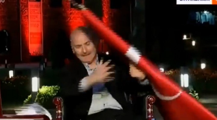 "Anadolu Soruyor" programında soruları yanıtlayan Süleyman Soylu'nun yanında bulunan Türk bayrağı rüzgar nedeniyle üzerine devrildi.