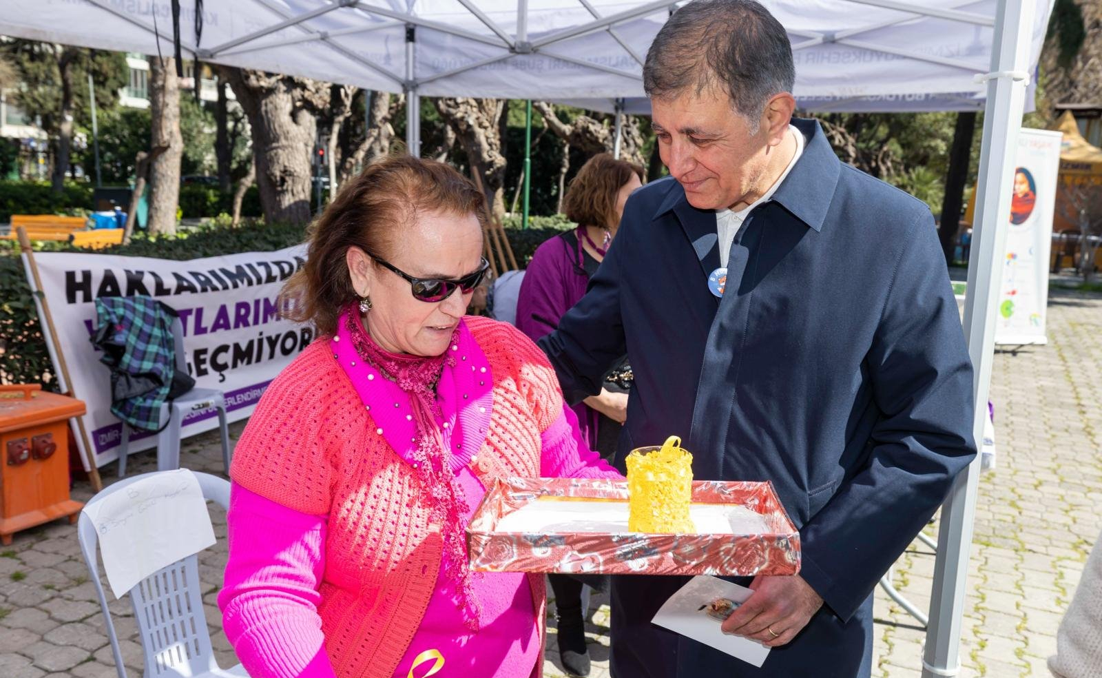 SMYRNA Güçlü Kadınlar Yardımlaşma ve Kültür Derneği standında, Başkan Dr. Cemil Tugay’ı duygulandıran anlamlı bir sürpriz yaşandı. Şirin Yücel, Başkan Tugay’ın Karşıyaka Belediye Başkanlığı döneminde yaşadıkları özel bir anıyı hatırlattı. Yücel, bir etkinlik sırasında son kalan limonatayı Başkan Tugay’ın almayarak kendisine ikram ettiğini ve "Önce kadınlar" dediğini belirtti. Yücel, o anıyı unutmayarak yıllarca beklediği bir hediyeyi, o limonatanın bardağını Başkan Tugay’a takdim etti. Beklenmedik bu sürpriz karşısında teşekkürlerini ileten Başkan Tugay, duygusal anlar yaşayarak gözyaşlarını tutamadı.