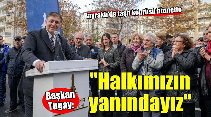 Başkan Tugay ayrıca, “Bizler bu memleketin yetiştirdiği evlatlarız, bu memlekete saygı ve sevgiyle bağlı insanlarız. Kim olursa olsun herkese sevgi ve saygıyla bağlıyız. Hizmet etme inancı ve kararlılığıyla bu göreve geldik. Çünkü uzun zamandır bu milleti birbirinden ayıran, kutuplaştıran, birbirine düşman etmeye çalışan bir siyasete maruz kalıyoruz. Bu; böl, parçala, yönet anlayışıdır. Hayır. Biz bu milletin hiçbir anlamda ayrışmasını, başkalaştırılmasını, dışlanmasını kabul etmiyoruz. Her bir vatandaşımız bizim için kıymetlidir. Bizden hizmet istesinler. Biz onları sıraya sokalım, gücümüzün yettiğince hızlı yapalım. Söz verdim; hatta yemin ettim; bu belediyenin her bir kuruşu çok dikkatli kullanılacak. Hiçbir zaman israf içinde olmayacağız. Elimizdeki bütün kaynakları insanlarımızın ihtiyaçlarına, hizmetlerine kullanacağız. Bir tarih yazacağız. İzmir’de 25 bin sosyal konut yapacağız. İnsanlarımızı çok uygun fiyatlarla konut sahibi yapacağız. Tanzim satış marketlerimizi yeniden açacağız. Sakın ola hiç kimse başını öne eğmesin. Dimdik durun. Milletimizin dik durmasına evlatlarımızın ihtiyaçları var. Gençlerimiz de başka bir ülke için değil Türkiye için çalışmayı istesin. Bu güzel köprü hayırlı olsun. Nice açılışlarda hep birlikte olalım” dedi.