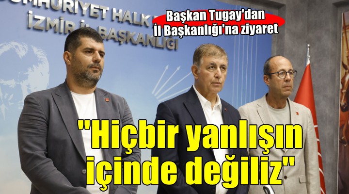 Başkan Tugay, “Bugün gerçekten üzüntümü dile getirmek ve aynı zamanda bundan sonraki süreçte il yönetimimizle beraber, parti örgütümüzle beraber nasıl bir yol izleyeceğimizle ilgili görüş alışverişinde bulunmak için buradayım. Bir kere burası bütün Cumhuriyet Halk Partililer için baba ocağıdır. İl binalarımız, ilçe binalarımız, hepsi bizim için yuvadır. Buralarda partimizi geleceğe daha iyi nasıl taşırız bunu konuşuruz. Bu duygu ve düşünceyle her zaman evimizde, yuvamızda bir araya gelebiliriz. Bugün de böyle bir anlayışla buradayız” diyerek konuşmasına başladı.