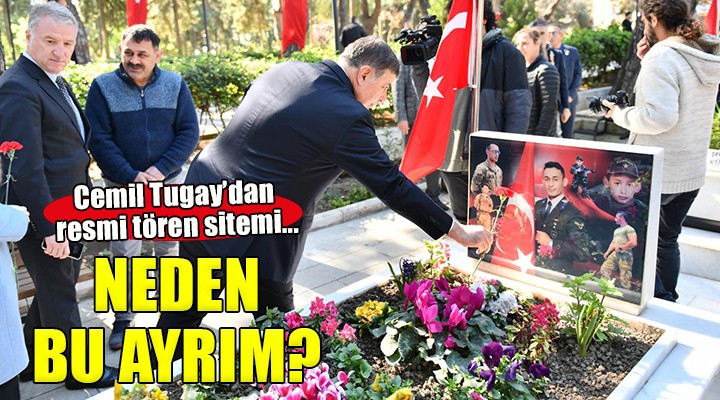 Başkan Tugay, böyle bir günde iki ayrı anma programının yapılmasına da sitem ederek, “Burada resmi törenleri iki aşamalı yapmamız çok üzücü. İronik olan şey de Sayın AK Parti İlçe Başkanı’nın da ikinci bölüme katılması. Halbuki hükümet onlarda. Bunu değiştirebilirler. Aynı yerde tüm sivil toplum kuruluşları, siyasi partiler temsilcileri birlikte törene katılsa ne güzel olur. Neden bu ayrım” diye sordu.