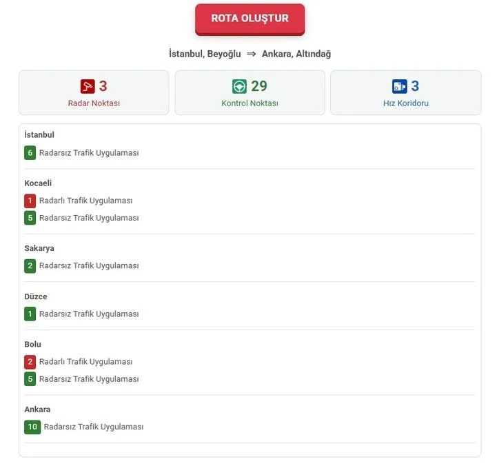 Örneğin İstanbul Beyoğlu'ndan Ankara Altındağ'a gidecek bir sürücü, 3 radar noktası, 29 kontrol noktası ve 3 hız koridorundan geçiyor.
