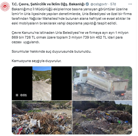 SONKALEİZMİR-Çevre Şehircilik ve İklim Değişikliği Bakanlığı'nın sosyal medya hesabından yapılan açıklamada şöyle denildi: "Bakanlığımız İl Müdürlüğü ekiplerince basına yansıyan görüntüler üzerine İzmir'in Urla ilçesinde yapılan denetimlerde, Urla Belediyesi ve özel bir firma tarafından Yağcılar Mahallesi'nde bulunan alana hafriyat ve evsel atıklar ile eski mobilyaların bırakılarak vahşi depolama yapıldığı tespit edildi. Çevre Kanunu'na istinaden Urla Belediyesi’ne ve firmaya ayrı ayrı 1 milyon 869 bin 726 TL olmak üzere toplam 3 milyon 739 bin 452 TL idari para cezası uygulandı. Sorumlular hakkında suç duyurusunda bulunuldu. Kamuoyuna saygıyla duyurulur."