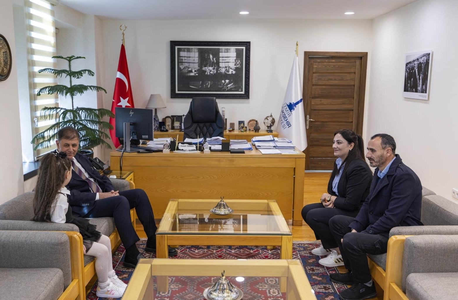 İzmir Büyükşehir Belediye Başkanı Dr. Cemil Tugay, İstiklal Marşı’nın 12 Mart 1921’de Türkiye Büyük Millet Meclisi (TBMM) tarafından kabulünün 105. yılında anlamlı bir buluşmaya ev sahipliği yaptı. İzmir Sanat’taki makamında, 4 yaşından itibaren İstiklal Marşı’nın 10 kıtasını ezbere okuyan 7 yaşındaki öğrenci Meryem Esila Şen ve ailesini ağırlayan Başkan Tugay, ziyaretten duyduğu mutluluğu dile getirdi. Buluşmada, Başkan Tugay’a sosyal medya üzerinden ulaşan anne Ayşe Şen ve baba İsmail Şen de eşlik etti. Yeşilyurt Agah Efendi İlkokulu birinci sınıf öğrencisi Esila ile sohbet eden Başkan Tugay, minik öğrenciye hediyeler de takdim etti.