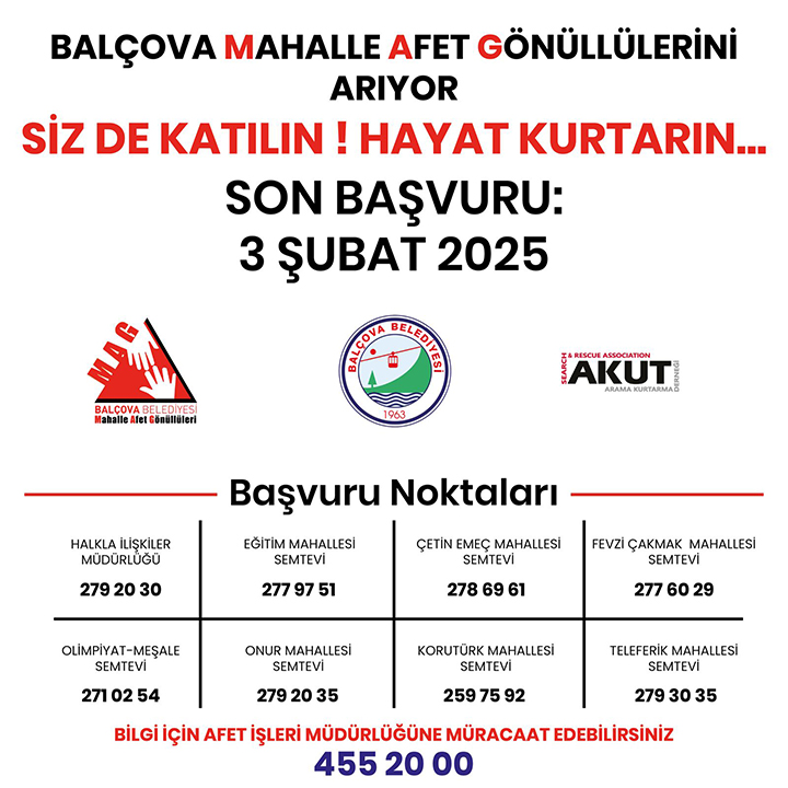 Vatandaşların Belediye Halkla İlişkiler Müdürlüğü ve mahallelerdeki semt evlerine müracaat edebileceği belirtildi. Ayrıca Belediye Afet İşleri Müdürlüğü’nden de bilgi alınabileceği ifade edildi. Geçen yıl içerisinde olası afetlere hazırlıklı olma amacıyla Balçova Belediyesi Arama Kurtarma Timi’ni (BALKUT) kurduklarını belirten Belediye Başkanı Onur Yiğit, şimdi de afetlere karşı hazırlıklı olma gücünü artırma amacıyla gönüllü arayışına girdiklerini söyledi.