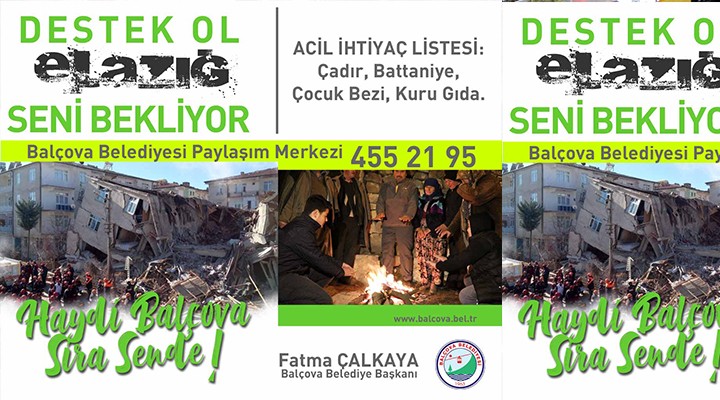 Balçova Belediye Başkanı Fatma Çalkaya’nın sosyal medya hesaplarından duyurulan yardım kampanyasında bölgeye gönderilmek üzere; battaniye, çadır, çocuk ayakkabısı, kadın pedi, çocuk bezi gibi malzemelerin kabul edileceği duyuruldu. Yardımda bulunacak vatandaşların malzemeleri Balçova Belediyesi’ne ulaştırmaları istendi. 2011 yılında Van Depremi’nde Balçova Belediyesi’nin benzer bir kampanya yaptığını belirten Başkan Çalkaya “Elazığ ve Malatya’da hayatını kaybeden vatandaşlarımıza Allah’tan rahmet yaralılara da acil şifalar diliyorum. Böyle günlerde el ele vererek birbirimize destek olacağız. 2011 yılında Balçova Halkı’nın destekleri ile 1 TIR malzemeyi Van’daki kardeşlerimize göndermiştik. Şimdi de tek yürek olarak Elazığ’a destek olacağız” dedi.