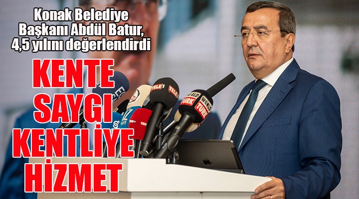 Batur, sözlerine Türkiye Cumhuriyeti’nin Kurucusu Ulu Önder Gazi Mustafa Kemal Atatürk’ün, “Vatanını en çok seven görevini en iyi yapandır" sözünü ilke edinerek, doğaya, insana, kadına, çocuğa, engelliye, can dostlara saygılı; odağında insanların dünyayı paylaştığı tüm canlıların olduğu bir belediyecilik anlayışıyla çalıştıklarını vurgulayarak başladı. Hizmet dönemine 2019 yılında "Birlikte Konak" anlayışıyla başladığını belirten Batur, 4 buçuk yıllık hizmet döneminde dayanışmayı büyüttüğünü, kaynakları verimli kullanarak yatırımları çoğalttıklarını kaydetti. Konaklılar için en iyisini, en doğrusunu ve en güzelini gerçekleştirmeyi hedeflediklerini söyleyen Batur, “Aldığımız görevin, üstlendiğimiz sorumluluğun bilinciyle işimize sımsıkı sarıldık. İhtiyacı olana el uzatan, derdi olanı dinleyen bir belediye olduk. ‘Kente saygı, kentliye hizmet’ inancıyla, 7'den 70'e tüm hemşehrilerimize ayrım yapmaksızın kucak açtık, açmaya devam ediyoruz. Tüm ekiplerimizle yorulmadan, şikâyet etmeden doğru işler üretmeyi sürdürüyor, Konak'ı geleceğe taşıyoruz” dedi.