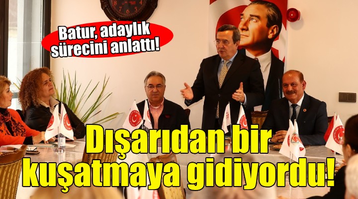 2019 yılında yapılan yerel seçimlerde yine büyükşehir belediye başkanı aday adayı olduğunu anımsatan Batur, “O zaman iki aday masada kaldı; Tunç Başkanım ve ben. Genel Merkezimiz, Tunç Başkanımızı değerlendirdi ve bizi de Konak’ta görevlendirdi. Genel başkanıma, yöneticilerimize teşekkür ederim. Dört dönem belediye başkanlığı yaptıktan sonra Konak’ta değerlendirilmemiz bizim için bir onurdu. Bu süre içinde de büyükşehir belediye başkanımızla gayet uyumlu bir şekilde çalıştık, beraber projeler ürettik. Şimdi neden aday olduk? Biz adayı tarif ederken, ‘İzmir tecrübe ister, İzmir samimiyet ister, İzmir İzmirli ister” dedik. Baktık dışarıdan bir kuşatmaya doğru gidiyordu bu iş. Bizim de alternatif olarak sahada olmamız lazımdı. 25-30 senedir partimize hizmet ediyoruz. Belediyecilik tecrübem var. İzmir’i tanıyoruz, İzmirli beni tanıyor. Konulara hâkimiz. Genel merkezimiz takdir eder görev verirse, en iyi şekilde yapacağıma eminim” diye konuştu.