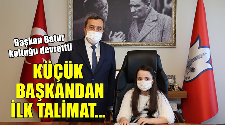 Türkiye Cumhuriyeti’nin kurucusu Ulu Önder Gazi Mustafa Kemal Atatürk’ün çocuklara armağanı olan 23 Nisan Ulusal Egemenlik ve Çocuk Bayramı kutlamaları çerçevesinde Konak Belediye Başkanı Abdül Batur’un koltuğuna bugün Konak 80. Yıl İlkokulu 4. sınıf öğrencisi Kumsal Kılıç oturdu. Kumsal Kılıç’ın Başkanlık koltuğuna oturduğu törende, kendisine Konak 80. Yıl İlkokulu Müdürü Ahmet Özgül, Sınıf Öğretmeni Ragıp Aksun, babası Aşkın Kılıç ve annesi Ayten Kılıç eşlik etti. Konak Belediye Başkanı Abdül Batur’a kendilerini makamında kabul ettikleri için teşekkür eden Kumsal Kılıç’ın ilk talimatı, okulların ağaçlandırılması oldu. Kumsal kılıç, “Eğitim-öğretim gördüğümüz, ikinci yuvamız olan okullarımızın, bahçelerinin daha yeşil olması için, gerekli ağaçlandırma çalışmalarının, desteklerinizle, arttırılacağına inanıyorum” dedi. Konak Belediyesi’nin “Al Götür, Oku Getir” sloganı ile hayata geçirdiği, Çocuk Kitaplıklarının her semte yaygınlaştırılması önemsediğini ve desteklediğini belirten Kumsal Kılıç, sokak hayvanlarına yönelik çalışmalarından dolayı, Başkan Batur’a teşekkür etti. Başkan Batur ise minik kumsala tek doğru yolun Ulu Önder Gazi Mustafa Kemal Atatürk’ün yolu olduğunu hatırlatarak Nutuk kitabı hediye etti.