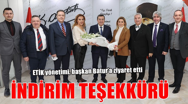Konak Belediyesi’nin ‘Katı Atık Bedeli’nde indirime gitmesi üzerine, Etik Ege Turistik İşletmeler Birliği Başkanı Mehmet İşler ve Yönetim Kurulu, Konak Belediye Başkanı Abdül Batur’a teşekkür ziyaretinde bulundu. Konak Belediyesi’nin Şubat ayı Meclis Toplantısında, Otel İşletmelerinin 01 Ocak 2022 tarihinden itibaren geçerli olmak üzere 2021 yılı Katı Atık Bedeli üzerinden ücretlendirilmeye devam edilmesi karara bağlanmıştı. En fazla üyesi Konak’ta bulunan Etik Ege Turistik İşletmeler Birliği Başkanı Mehmet İşler ‘Katı Atık Bedeli’nde indirime gidilmesi ve diğer yerel yönetimlere örnek olması bakımından teşekkürlerini iletirken Başkan Batur, özellikle pandemi döneminde esnafla, işletmelerle omuz omuza verdiklerini, karınca kararınca destek olmaya çalıştıklarını söyledi.