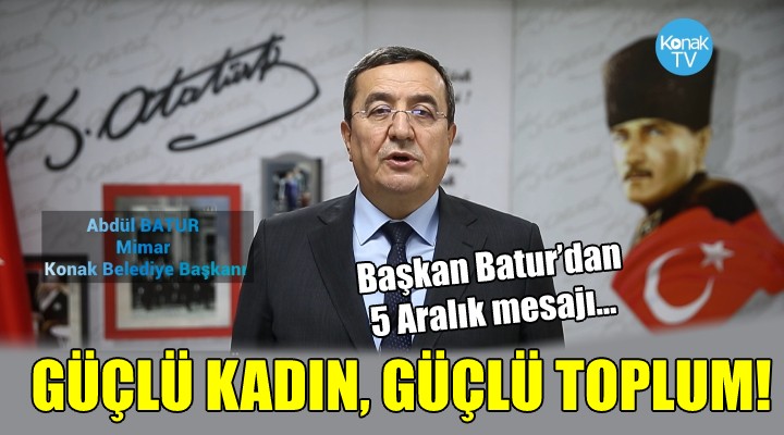 Konak Belediye Başkanı Abdül Batur, Türkiye'de kadınlara seçme ve seçilme hakkının tanınmasının 86’ncı yıldönümünü yayınladığı mesaj ile kutladı. Mesajında Türk kadınının, seçme seçilme hakkına birçok devletten önce sahip olduğuna dikkat çeken Başkan Batur, Konak’ta kadın dostu bir belediye hedeflediklerinin altını çizdi. “Güçlü kadın olmazsa, güçlü toplum olmaz” sözleri ile kadının hayatın her alanında güçlenmesini desteklediklerini vurgulayan ve bu amaca yönelik olarak sivil toplum kuruluşları ile birlikte kadını destekleyen projeleri hayata geçirdiklerini dile getiren Başkan Batur’un mesajında şu ifadeler yer aldı: