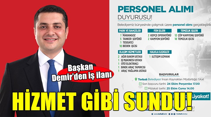 "Torbalı Belediyesi olarak personel alımlarımızı hakkıyla istihdam ilkesiyle ‘Önce Liyakat’ diyerek gerçekleştiriyoruz. Bu kapsamda Temizlik İşleri Müdürlüğümüze 30, Park ve Bahçeler Müdürlüğümüze 17, Ulaşım Hizmetlerimize 6, Fen İşleri Müdürlüğümüze 4 ve Halkla İlişkiler Müdürlüğümüze de 1 personel alınacaktır. Tüm halkımıza duyurulur."