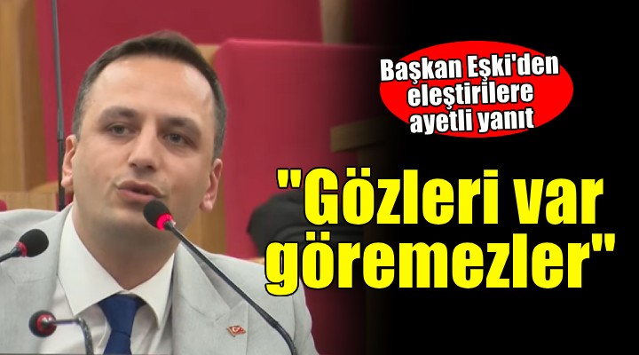 Pala'nın ardından söz alan Bornova Belediye Başkanı Ömer Eşki ise eleştirilere ayetle yanıt verdi. Araf Suresi 179'uncu ayetini Arapça söyleyen ve Türkçe tercümesini yapan Başkan Eşki, "Değerli meclis üyemiz araştırmış ama bizim büyük projelerimizi bulamamış. Kendisine bir ayet ile cevap vereceğim. Araf Suresi 179. Yani gözleri var göremezler, kulakları var duyamazlar diye. Ben davetimi yeniliyorum. İstediğiniz zaman buyurun gelin. Proje nedir, ne zaman nasıl hayata geçirilir, bunu size anlatmaktan büyük keyif duyacağım" dedi.
