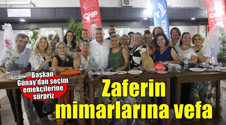 Seçim döneminde broşür dağıtan saha ekibinden şoförlere, ofis çaycısından temizlikçisine, meclis üyesi adayından ilçe yöneticisine partili herkesi tek tek arayarak sürpriz programda bir araya getiren Başkan Günay ‘Alın teriniz emanetimiz, emeklerinizi asla unutmadım ve unutmayacağım’ mesajı verdi. Seçim çalışmalarında yer alan herkesin görselinin olduğu bir klip hazırlatan başkan Günay, gece boyunca partililere duygusal anlar yaşattı.