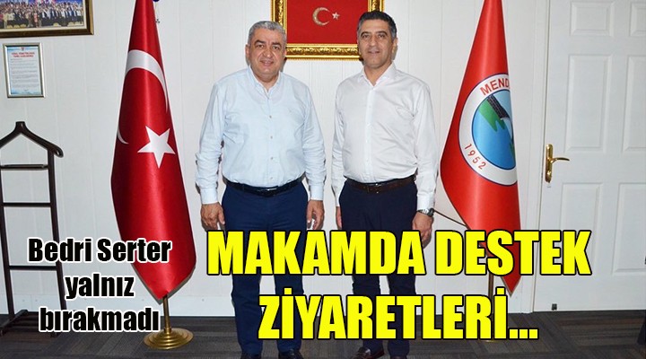 SONKALEİZMİR- Menderes Belediye Başkanı Mustafa Kayalar, sabah saatlerinden itibaren makamında ziyarete gelen partilileri ve yurttaşları ağırladı. CHP İzmir Milletvekili Bedri Serter de Kayalar'ı makamında ziyaret edip sohbet etti. Desteğini dile getiren Serter, Başkan Kayalar ile birlikte fotoğraf da çektirdi.
