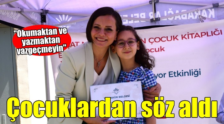 Okuduğu kitaplarla sözlerini paylaşan çocuklarla birlikte olmaktan duyduğu mutluluğu dile getiren Başkan Kınay, Karabağlar’da okumaktan, yazmaktan, sözlerini paylaşmaktan, kültürden ve sanattan vazgeçmeden tüm bu değerleri büyüteceklerini söyledi. Aydınlık Türkiye’yi, Ulu Önder Mustafa Kemal Atatürk’ün gösterdiği yolda birlikte yürüyeceklerini vurgulayan Başkan Kınay, çocuklarla birlikte şarkılar söyleyip eğlendikleri konserler ve etkinlikler düzenlemek istediklerini ifade etti. Konuşmasının ardından Başkan Kınay, çocuklardan daha çok kitap okumak, yazmak ve okuduklarını arkadaşlarıyla paylaşmaktan vazgeçmeme sözü aldı.