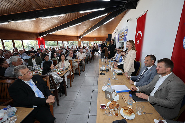 Konak Belediye Başkanı Nilüfer Çınarlı Mutlu, Konaklı muhtarlarla bir araya gelerek yeni dönemde birlikte, uyum içinde ve çözüm odaklı çalışacakları mesajını verdi. Çınartepe Aydın Erten Rekreasyon Alanı’nda düzenlenen toplantıda Başkan Mutlu’yla birlikte CHP Konak İlçe Başkanı Ozan Ali İlgazi, Konak Belediyesi bürokratları, müdürler ve meclis üyeleri yer aldı. Başkan Mutlu, belediyenin bürokrat ekibini de muhtarlara tanıttı ve “Ekibimiz güçlenerek, yenilenerek devam ediyor. Önümüzdeki beş yılda birlikte çok güzel işlere imza atacağımıza inanıyorum” dedi.