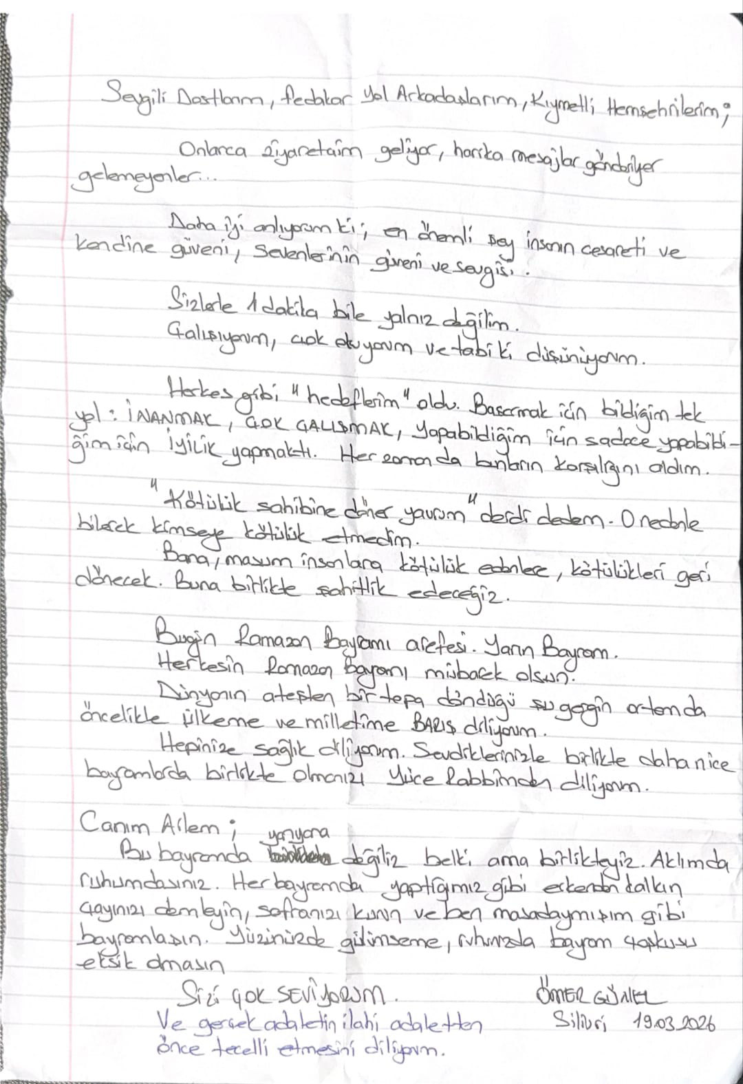 Bu bayramda yan yana değiliz belki ama birlikteyiz. Aklımda ruhumdasınız.Her bayramda yaptığımız gibi erken kalkın çayınızı demleyin, sofranızı kurun ve ben masadaymışım gibi bayramlaşın. Yüzünüzde gülümseme, ruhunuzda bayram coşkusu eksik olmasın.