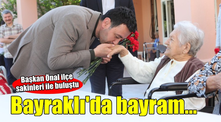 Yerel seçimler sonrası mazbatasını alır almaz göreve başlayan Bayraklı Belediye Başkanı İrfan Önal, Ramazan Bayramı’nın ilk gününde ilçe sakinleriyle bir araya geldi. Merkez Camisi’nde bayram namazını kılan ve vatandaşlarla sohbet edip bayramlaşan Başkan Önal, Bayraklı’nın çınarlarını da unutmadı. Önal, cami sonrası Nafiz Gürman Mahallesi’ndeki Şehit Asteğmen Adem Dertsiz Huzurevi Yaşlı Bakım ve Rehabilitasyon Merkezi’ni ziyaret etti. Huzurevi sakinlerinin tek tek ellerini öperek bayramlaşan Önal, karanfil dağıttı. Önal, Huzurevi ziyareti sonrası ise Şehit Uygar Yalçınkaya’nın ailesine bayram ziyaretinde bulundu.
