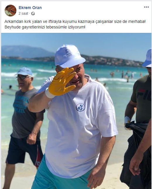 SONKALE- 31 Mart yerel seçimlerinde 14 bin 425 oy alarak yüzde 53.7 ile ipi göğüsleyen, sonrasında ise plajlardaki işgallerle ilgili kararlı tutumuyla öne çıkan Çeşme Belediye Başkanı Ekrem Oran, sosyal medya hesabından dikkat çeken bir paylaşım yaptı. Özellikle facebook'u etkili kullanan Başkan Oran, yine bu mecraadan, "Arkamdan kırk yalan ve iftirayla kuyumu kazmaya çalışanlar size de merhaba! Beyhude gayretlerinizi tebessümle izliyorum!" ifadelerine yer verdi.