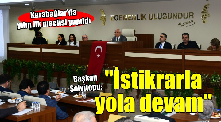 Toplantının açılışında konuşan Başkan Selvitopu, meclis üyelerinin ve tüm vatandaşların yeni yılını kutladı. Yaşadığımız şehit acıları nedeniyle yeni yıl kutlamaları iptal ettiklerini hatırlatan Başkan Selvitopu, “12 şehidimizi ve tüm şehitlerimizi rahmetle, minnetle anıyoruz” dedi. Daha sonra belediye çalışmalarıyla ilgili meclis üyelerini bilgilendiren Başkan Selvitopu, “Hep birlikte Karabağlar Belediyesi’ni kendi ayakları üzerinde duran ve hizmet üretebilen bir belediye haline getirdik. Dar bütçemize rağmen önemli işler yapmayı başardık. Bundan sonra da aynı anlayışla çalışmayı sürdürecek ve aynı istikrarla yolumuza devam edeceğiz” diye konuştu.