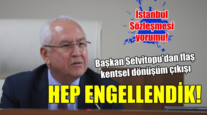 Selvitopu, "Bu konuda söyleyeceğimiz çok şey var. 2010 yılında Cennetçeşme'de 48 hektarlık alan için başvurduk, 2 yıl bakanlıkta bekletildik. O zaman başlasak şimdi bu Cennetçeşme'deki o alan bitmişti. Bunlara kimlerin engel olduğunu gerekirse belgelerle ortaya koyarız. Ancak bunlarla uğraşırsak iş yapamayız, ileriye gidemeyiz. Kentsel dönüşümde yerel yönetimlerin işin içinde olmasını söyledik. Çünkü kentin belleği yerel yönetimlerdir. Eğer Osman Aksünger ve Aşık Veysel Mahallesi projelerimiz onaylanmasını bekliyoruz. Nasıl uygulayacağımızı bakanlığa söyledik. Bir yasa düzenlemesi daha yapılırsa biz 540 hektara daha talibiz. Belediye olarak bilgi birikimimiz de kapasitemiz de var" dedi.