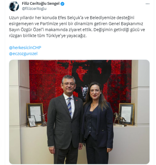 "Uzun yıllardır her konuda Efes Selçuk’a ve Belediyemize desteğini esirgemeyen ve Partimize yeni bir dinamizm getiren Genel Başkanımız Sayın Özgür Özel’i makamında ziyaret ettik. Değişimin getirdiği gücü ve rüzgarı birlikte tüm Türkiye’ye yayacağız"