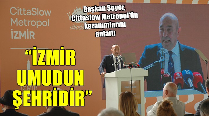 12 Haziran'da İtalya'da düzenlenen Uluslararası Cittaslow Birliği Genel Kurulu’nda İzmir dünyanın ilk Cittaslow Metropol kenti ilan edilirken, aynı zamanda dünyanın diğer şehirlerini de ağa dahil etmek için öncülük görevi üstlendi. İzmir'de yaklaşık bir yıldır sivil toplum temsilcileri, akademisyenler, uzmanlar ve kanaat önderleri ile dünyada uygulanabilecek bir büyükşehir yönetim modeli oluşturmak için Cittaslow Metropol projesi üzerinde çalışılıyordu. “Yavaş yaşam” felsefesiyle hazırlanan Cittaslow Metropol Projesi ile insan odaklı, kentin değerlerini koruyan, sürdürülebilir, yüksek yaşam kalitesini hedefliyor. İzmir Büyükşehir Belediye Başkanı Tunç Soyer büyük titizlikle hazırlanan projenin detaylarını anlattı.