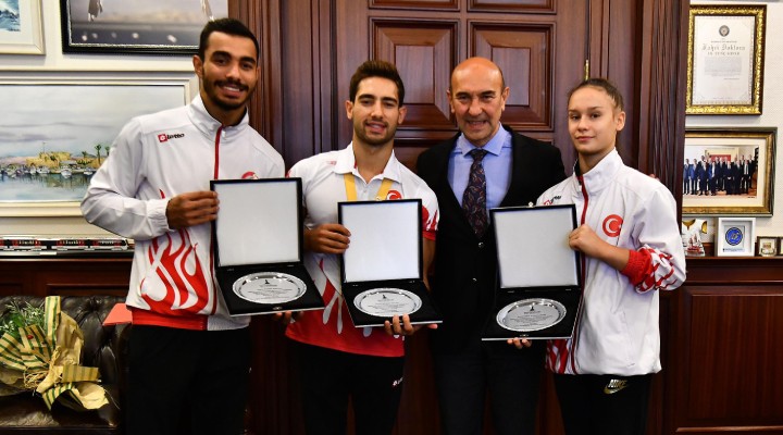 Başkan Soyer, Dünya Artistik Cimnastik Şampiyonası'nda halka dalında Dünya Şampiyonu olan İbrahim Çolak, 2016 yılında olimpiyatlara artistik cimnastik dalında katılan ilk Türk cimnastikçisi unvanına sahip, bu yıl ise Avrupa üçüncüsü ve dünya beşincisi olma başarısını yakalayan Ferhat Arıcan ve Türkiye'nin olimpiyatlara gitme hakkı kazanan en genç sporcu unvanını alan Nazlı Savranbaşı'nı tebrik ederek, plaketlerini sundu.