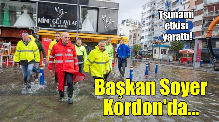 İzmir Büyükşehir Belediye Başkanı Tunç Soyer, deniz kabarması olarak adlandırılan meteorolojik olay sebebiyle deniz sularının sokakları kapladığı Kordon’a giderek çalışmaları inceledi. Gece boyunca sahadaki ekipleri yönlendiren Başkan Tunç Soyer günün ağarmasıyla birlikte durum tespiti için sorunlu bölgelere gitti. Soyer’e İZSU Genel Müdürü Ali Hıdır Köseoğlu ile İtfaiye Dairesi Başkanı İsmail Derse eşlik ederek son durum hakkında bilgi verdi. Başkan Soyer’in görüştüğü yetkililer deniz seviyesinin yükselmesinin tsunami etkisi yarattığını ve denizin karadan yüzlerce metre içerilere ilerlediğini söyledi.