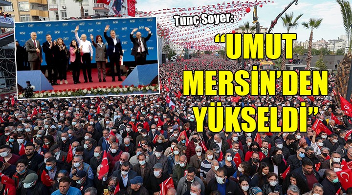 CHP Genel Başkanı Kemal Kılıçdaroğlu, acil erken seçim isteğiyle yapacağını açıkladığı mitinglerin ilkini Mersin'de düzenledi. Mitinge İzmir Büyükşehir Belediye Başkanı Tunç Soyer’in çağrısı üzerine İzmir'in ilçe belediye başkanları da katildi. "Umut Mersin'den yükseldi" diyerek bir değerlendirme yapan Başkan Soyer, şunları söyledi: