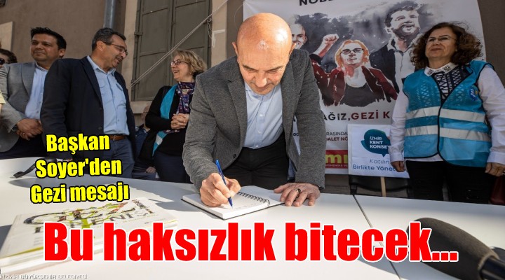 Başkan Soyer, Gezi Davası’nda tutuklanan Mücella Yapıcı, Can Atalay ve Tayfun Kahraman'a hitaben anı defterine yazdığı notta, “Can, Tayfun, Mücella güzel günler ufukta… Yaşadığınız haksız ve hukuksuz mahkumiyet hepimizin canını acıtıyor. Mücadelenizden korktuklarının kanıtı verilen cezalardır. Güçlü oldukları için değil zayıf oldukları için size bu haksızlığı yapıyorlar. Asla umutsuzluğa kapılmayacak, özgürlüğünüze kavuşana kadar yanınızda durmaya devam edeceğiz” ifadelerini kullandı.