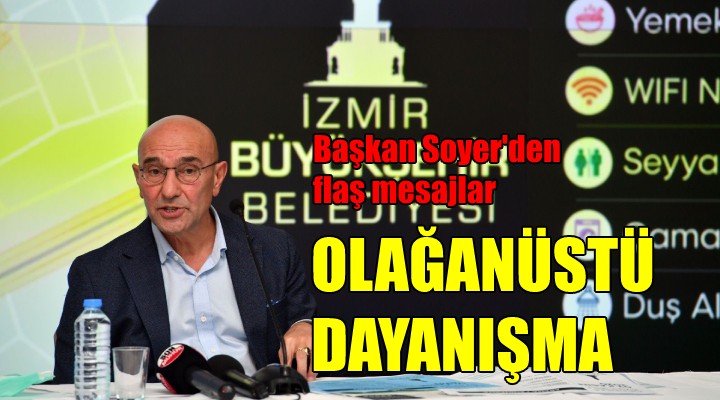 Dün itibariyle yeni bir çalışmayı başlattıklarını belirten Soyer, “Aile Çalışma ve Sosyal Hizmetler Bakanlığımız ile beraber İzmir Büyükşehir Belediyesi bünyesindeki psikolog ve sosyolog arkadaşlarımız alanlarda hem çocuklara hem yetişkinlere destek vermeye başladılar” dedi. Son 24 saat içinde tespit edilen eksik ve önemli ihtiyaçların seyyar tuvalet, duş, çamaşır makinesi, kurutma makinesi, sahra hastanesi yatağı, çadır matı, tüplü dış mekan ısıtıcısı, pilli aydınlatma, pil, kamp sandalyesi ve masası olduğunu söyleyen Soyer, pandemi döneminde başlatılan Halkın Bakkalı çalışmasının bugün tekrar devreye alındığını ve depremzedelere yardım için yemek, gıda, hijyen ve uyku tulumu başlıklarında 4 ayrı paketin satışa sunulduğunu hatırlattı: “Halkın Bakkalı üzerinden 6 bin 944 uyku tulumu bağışı aldık. İzmirliler pandemi döneminde de olağanüstü dayanışma örneği sergilemişlerdi. Şimdi yine aynı dayanışmayı görüyoruz. Deprem yardımları için lojistik merkez haline getirdiğimiz Aşık Veysel Rekreasyon Alanı’nda inanılmaz bir kuyruk vardı. İnsanlar evlerindeki dolmaları, börekleri, giysileri getirip bağışlamak istiyor. İzmirli olmakla övündüğümüz bir tablo bu. Yurttaşlarımız bir yandan Biz İzmir dijital platformu üzerinden Halkın Bakkalı’ndan dört paketle yardım yapabilir, bir yandan da bu başlıklar üzerinden ayni olarak desteklerini Aşık Veysel Rekreasyon Alanı’na ulaştırabilir” dedi.