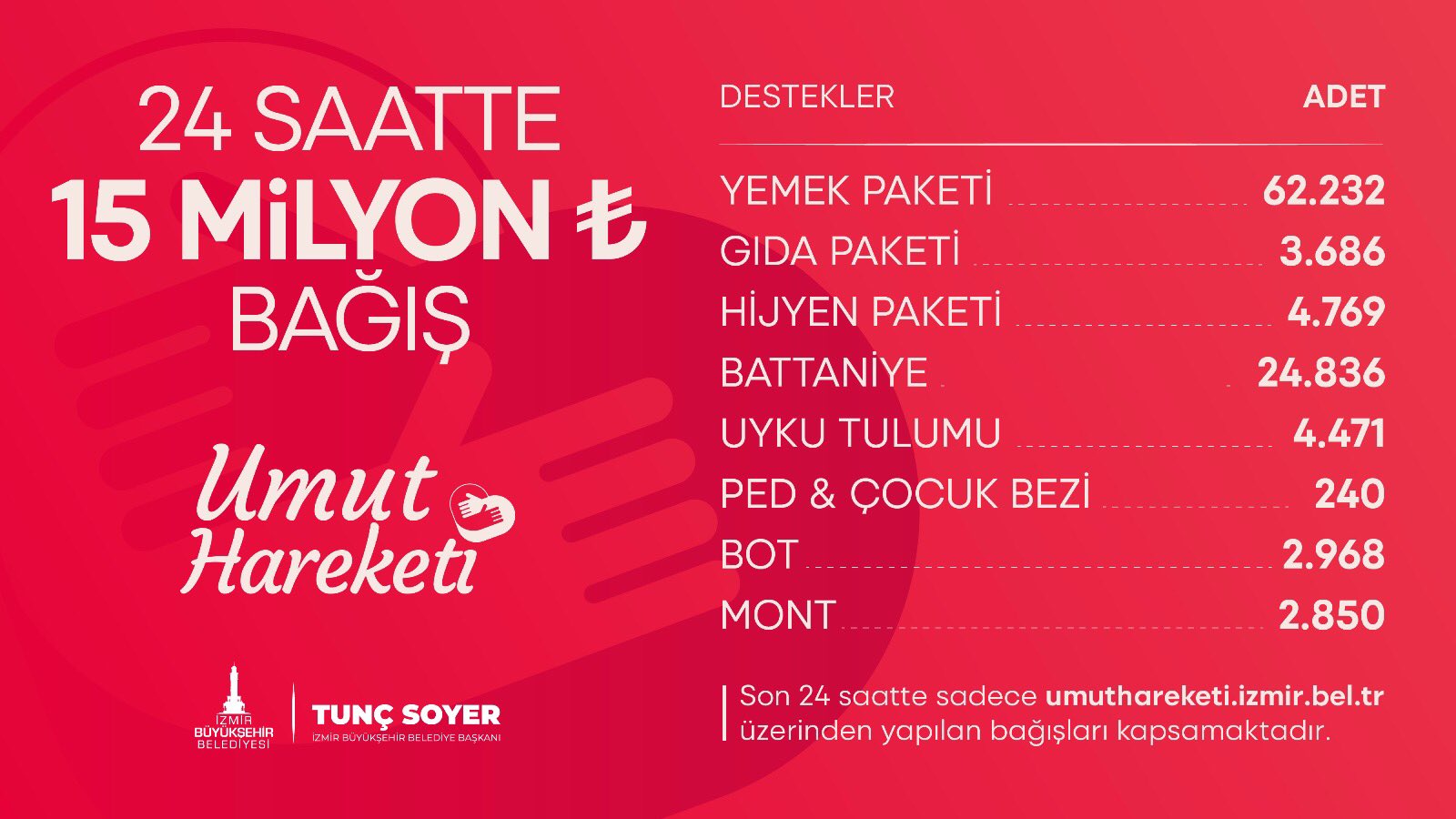 SONKALEİZMİR-İzmir Büyükşehir Belediye Başkanı Tunç Soyer, deprem bölgesine ulaştırılmak üzere toplanan yardımlarla ilgili sosyal medya hesabından açıklama yaptı. Depremin yaralarını sarmak için başlattıkları "Umut Hareketi" kampanyasında 24 saatte 15 milyon TL'lik bağış toplandığını vurgulayan Soyer, "Teşekkürler İzmir… Devam ediyoruz..." mesajını paylaştı.