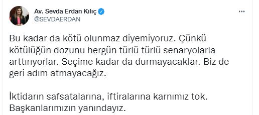 CHP İzmir Milletvekili Sevda Erdan Kılıç: "Bu kadar da kötü olunmaz diyemiyoruz. Çünkü kötülüğün dozunu hergün türlü türlü senaryolarla arttırıyorlar. Seçime kadar da durmayacaklar. Biz de geri adım atmayacağız. İktidarın safsatalarına, iftiralarına karnımız tok. Başkanlarımızın yanındayız."