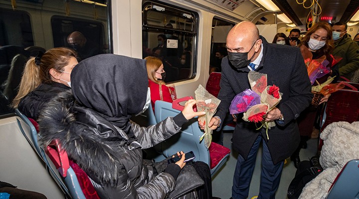 İzmir Büyükşehir Belediye Başkanı Tunç Soyer, 8 Mart Dünya Kadınlar Günü nedeniyle sabahın erken saatlerinde Karataş'taki Tarihi Asansör’ün önünde başlayarak sokakta kadınlara karanfil dağıttı. Kadın makinistler, mühendisler ve çalışanlarla birlikte Karataş'taki tramvay durağına kadar yürüyen Başkan Tunç Soyer tramvaya binerek kadın yolcuların 8 Mart’ını kutladı. Başkan Soyer, Konak'ta tramvaydan inerek İzmir Metrosu'nun Konak durağına kadar yürüdü. Metro ile Basmane istasyonuna giden Başkan Soyer metroda da kadın yolcuların gününü kutladı.