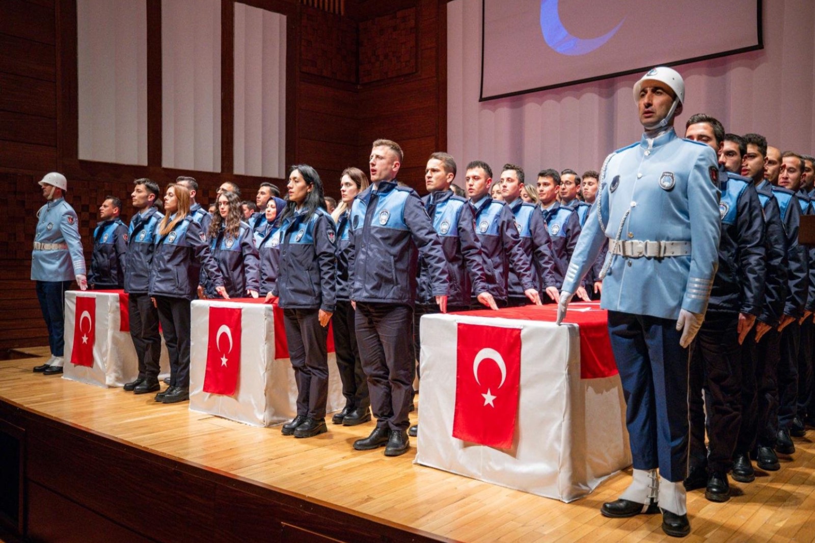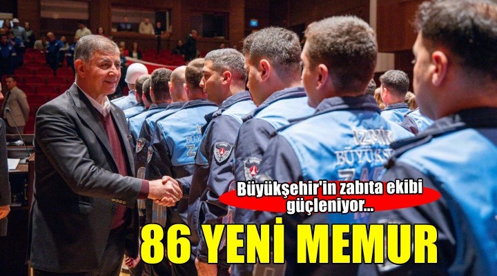 İzmir Büyükşehir Belediyesi, kente yönelik denetim ve kamu düzeni hizmetlerini daha etkin ve sağlıklı yürütmek amacıyla zabıta teşkilatını güçlendirmeye devam ediyor. Bu kapsamda zorlu eğitim süreçlerini tamamladıktan sonra zabıta teşkilatına katılan 86 yeni memur için Ahmed Adnan Saygun Sanat Merkezi’nde (AASSM) yemin töreni düzenlendi. İzmir Büyükşehir Belediye Başkanı Dr. Cemil Tugay’ın katılımıyla düzenlenen törende ayrıca İzmir Büyükşehir Belediye Başkan Vekili Dr. Zafer Levent Yıldır, İzmir Büyükşehir Belediyesi Genel Sekreteri Zeki Yıldırım ile bürokratlar ve zabıta personeli yer aldı.