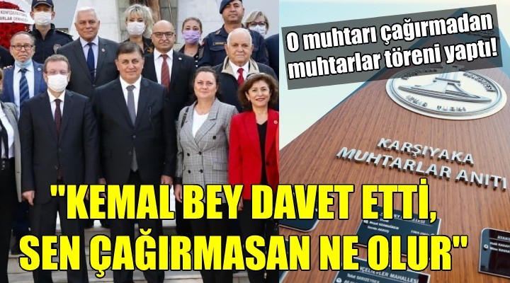 SONKALEİZMİR-Karşıyaka Belediye Başkanı Cemil Tugay, Muhtarlar Günü dolayısıyla ilçe muhtarlarının katılımıyla Mustafa Kemal Mahallesi'ndeki Muhtarlar Anıtı önünde çelenk töreni düzenledi. Başkan Tugay, kentsel dönüşüm imar planlarıyla arazilerinin yüzde 45'ine el konulduğunu öne süren yurttaşlarla birlikte önceki gün belediye önünde eylem yapan ve kendisine tepki gösteren Cumhuriyet Mahallesi Muhtarı Özay Dağhan'ı ise törene çağırmadı.
