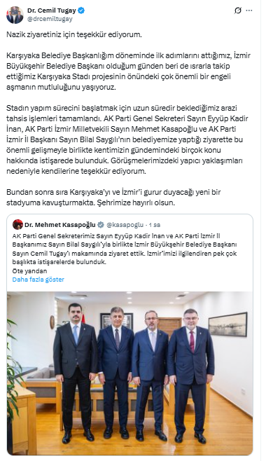 "Nazik ziyaretiniz için teşekkür ediyorum. Karşıyaka Belediye Başkanlığım döneminde ilk adımlarını attığımız, İzmir Büyükşehir Belediye Başkanı olduğum günden beri de ısrarla takip ettiğimiz Karşıyaka Stadı projesinin önündeki çok önemli bir engeli aşmanın mutluluğunu yaşıyoruz. Stadın yapım sürecini başlatmak için uzun süredir beklediğimiz arazi tahsis işlemleri tamamlandı. AK Parti Genel Sekreteri Sayın Eyyüp Kadir İnan, AK Parti İzmir Milletvekili Sayın Mehmet Kasapoğlu ve AK Parti İzmir İl Başkanı Sayın Bilal Saygılı’nın belediyemize yaptığı ziyarette bu önemli gelişmeyle birlikte kentimizin gündemindeki birçok konu hakkında istişarede bulunduk. Görüşmelerimizdeki yapıcı yaklaşımları nedeniyle kendilerine teşekkür ediyorum. Bundan sonra sıra Karşıyaka’yı ve İzmir’i gurur duyacağı yeni bir stadyuma kavuşturmakta. Şehrimize hayırlı olsun."