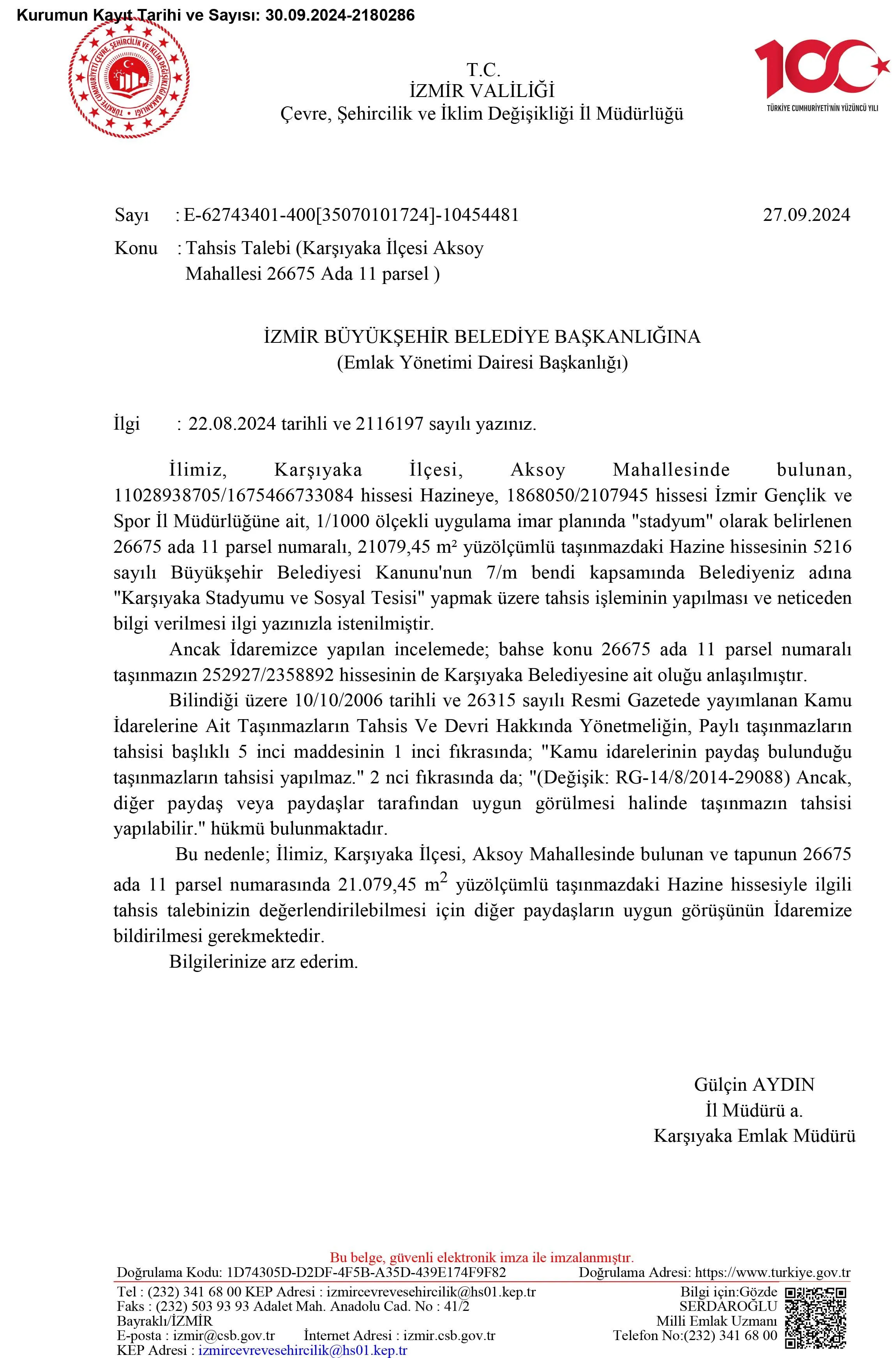 Büyükşehir Belediyesi'nin stat arazisi için Karşıyaka Belediyesi ve Gençlik Spor Bakanlığı ile yürüttüğü yazışmalar şöyle: