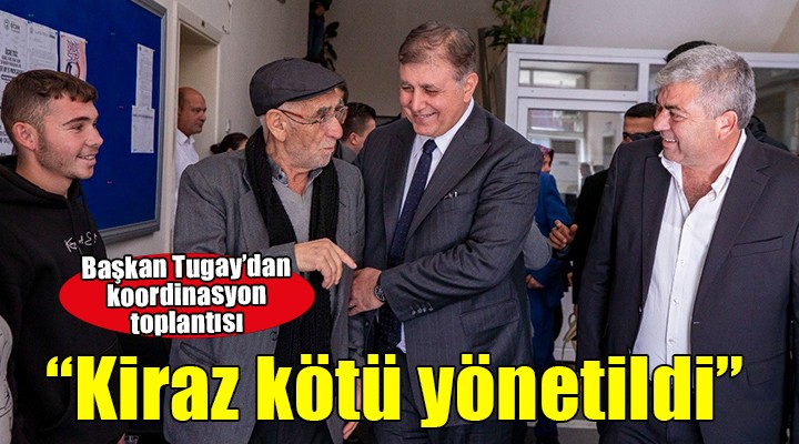 İzmir Büyükşehir Belediye Başkanı Dr. Cemil Tugay, ilçelerin sorunlarını yerinde görmek ve bu sorunları sağlıklı şekilde çözüme kavuşturmak için göreve gelir gelmez başlattığı koordinasyon toplantılarına Kiraz’da devam etti. Kiraz Belediye Başkanı Nasuh Coşkun'un ev sahipliğinde düzenlenen toplantıda, kente en iyi hizmeti sunmak için geliştirilen yol haritası paylaşıldı. İzmir Büyükşehir Belediyesi bürokratlarının da katıldığı toplantıda, ilçenin sorunları masaya yatırıldı.