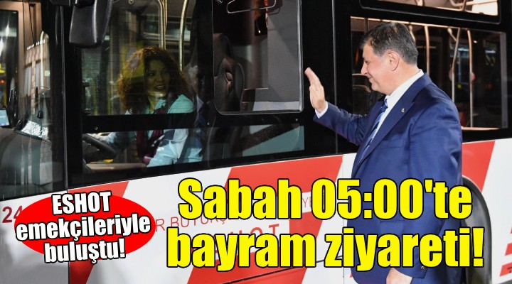 İzmir Büyükşehir Belediye Başkanı Dr. Cemil Tugay, bayramlaşma programına sabah 05.00'te başladı. ESHOT Genel Müdürlüğü personeli ile ESHOT'un Buca Gediz Atölyesi'nde bayramlaşan Başkan Tugay'ı, İzmir Büyükşehir Belediyesi Genel Sekreteri Barış Karcı ile ESHOT Genel Müdürü Erhan Bey karşıladı.