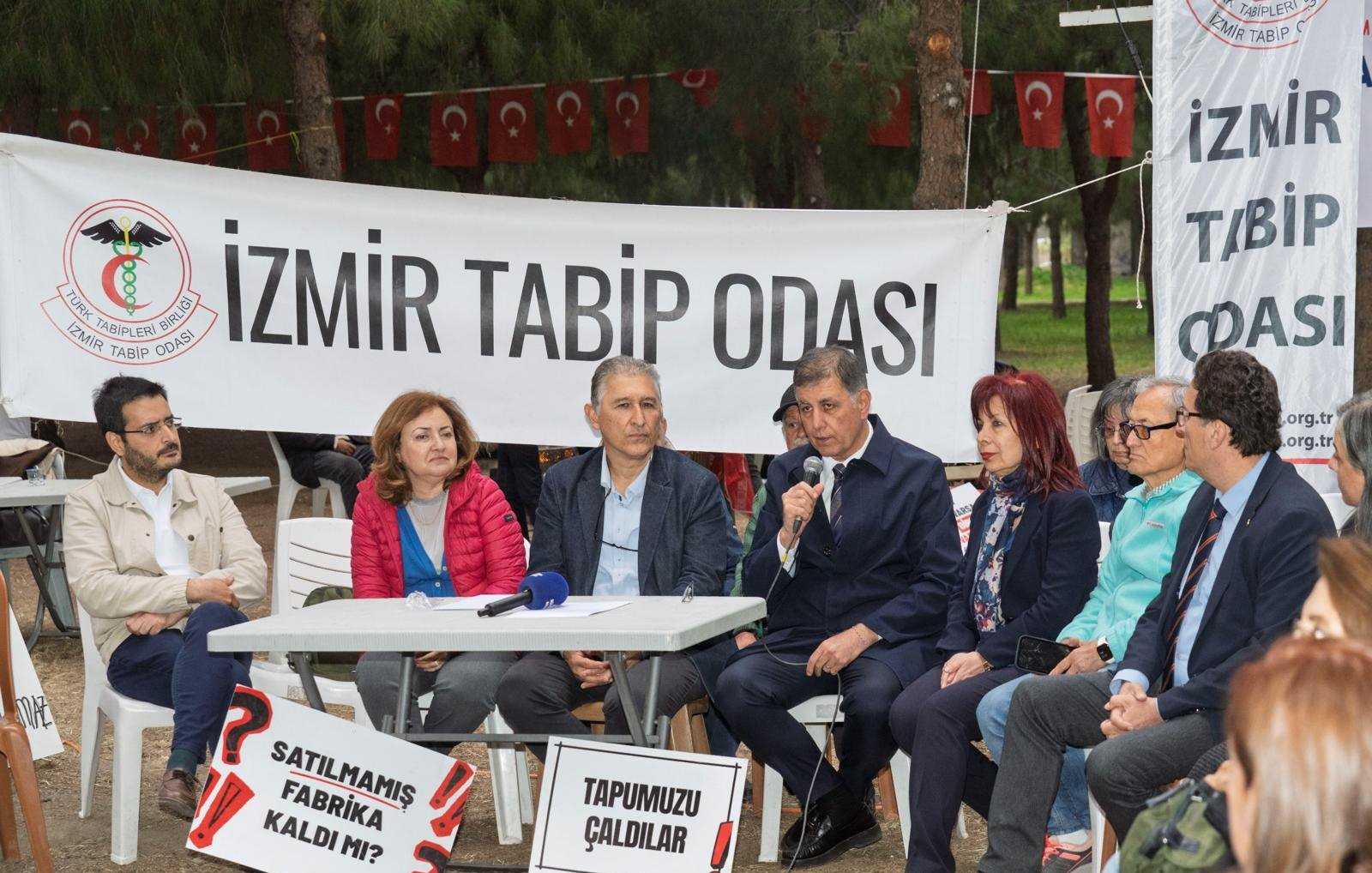 Mülkiyeti İzmir Büyükşehir Belediyesi’ne ait Meslek Fabrikası’na el koyma girişimine karşı İzmir Büyükşehir Belediye Başkanı Dr. Cemil Tugay’ın başlattığı nöbet, 9’uncu gününde devam ediyor. Siyasetçilerin, belediye başkanlarının, meslek odalarının, sivil toplum örgütlerinin ve binlerce İzmirlinin destek verdiği nöbete, İzmir Tabip Odası da düzenlediği “Sağlık” forumu ile katıldı. Hem Meslek Fabrikası’nın hukuki süreci hem de ülkedeki sorunların ele alındığı foruma katılan İzmir Büyükşehir Belediye Başkanı Dr. Cemil Tugay, büyük bir hukuksuzluk ve yanlışlıkla karşı karşıya olduklarını belirterek duruma tepki gösterdiklerini ifade etti. Tugay, 145 bin yurttaşın Meslek Fabrikası’nda açılan kurslara katıldığını, bu kişilerin büyük bölümünün iş sahibi olduğunu ya da farklı alanlarda istihdam edildiğini hatırlattı.