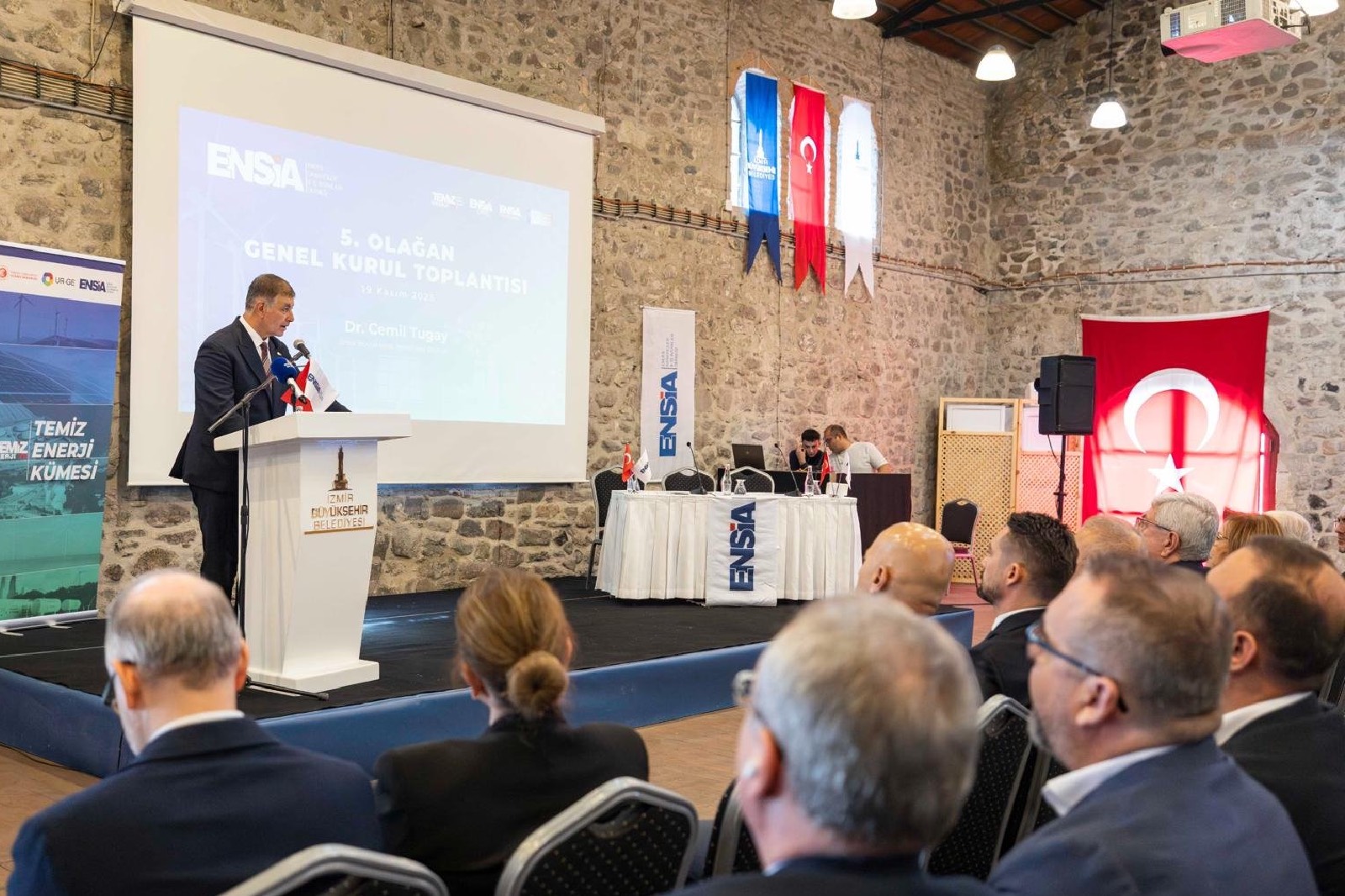 İzmir Büyükşehir Belediye Başkanı Dr. Cemil Tugay, Enerji Sanayicileri ve İş İnsanları Derneği’nin (ENSİA) 5. Olağan Genel Kurul Toplantısı’na katıldı. Tarihi Havagazı Fabrikası’nda düzenlenen toplantıya Başkan Dr. Cemil Tugay’ın yanı sıra Ege İhracatçı Birlikleri (EİB) Koordinatör Başkanı Jak Eskinazi, Batı Anadolu Sanayici ve İş İnsanları Derneği (BASİFED) Yönetim Kurulu Başkanı Semiha Güneş, ENSİA Yönetim Kurulu Başkanı Alper Kalaycı ve yönetim kurulu üyeleri, sivil toplum kuruluşları ile iş dünyasının temsilcileri katıldı. Genel kurulda ENSİA Yönetim Kurulu Başkanı Alper Kalaycı bayrağı Elvan Aygün Anbar’a devretti.
