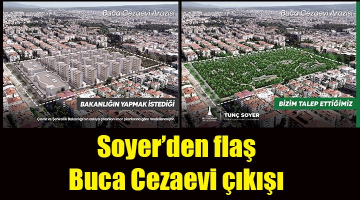 SONKALEİZMİR- Daha önce "Yapmayın. Buca'nın betona değil yeşile ihtiyacı var" açıklaması ile Buca Cezaevi arazisinin yeşil alan olarak kalmasını isteyen İzmir Büyükşehir Belediye Başkanı Tunç Soyer'den, yeni yıl öncesi çarpıcı bir çıkış daha geldi. İzmir'in en kalabalık ilçesi Buca'nın tam kalbindeki 69 bin metrekarelik arazinin yapılaşmaya açılmasına karşı çıkan Başkan Soyer, sosyal medya hesabından dikkat çeken iki görsel paylaştı. Buca Cezaevi arazisine Çevre, Şehircilik ve İklim Değişikliği Bakanlığı'nca yapılmak istenen konut projesinin görseli ile İzmir Büyükşehir'in olmasını istediği şeklin görselini paylaşan Başkan Soyer, altına ise "Buca'ya reva görülen / Buca'nın hak ettiği" notunu düştü.