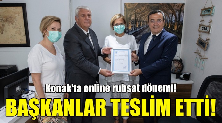 Konak Belediye Başkanı Abdül Batur ile İzmir Esnaf ve Sanatkarlar Odaları Birliği Yönetim Kurulu Başkanı Zekeriya Mutlu, belediyenin geçtiğimiz haziran ayında başlattığı online ruhsat hizmetinden yararlanarak ruhsatlarını alan Konaklı esnaflara belgelerini elden teslim etti.